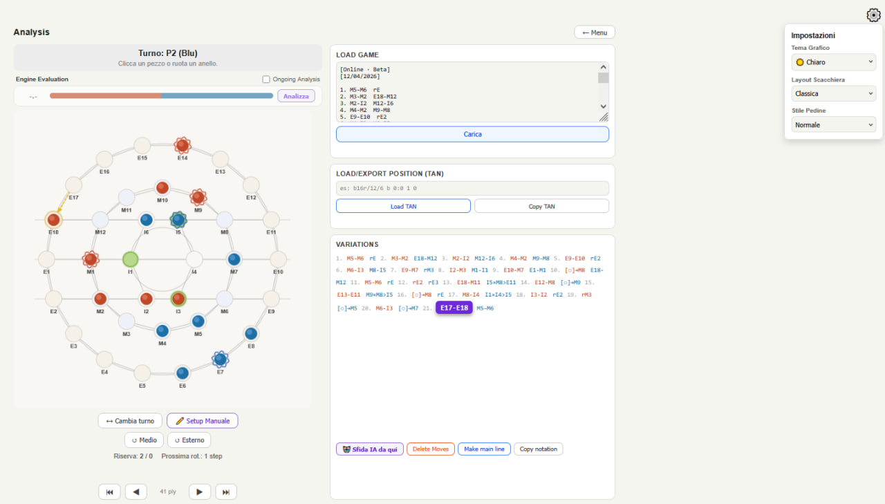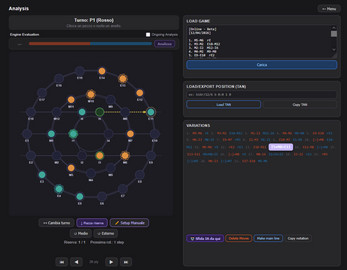 The game has an engine opponent with configurable playing style, online multiplayer via room codes, a spectator mode, an analysis board, and a strategic guide to help you understand the recurring patterns.
