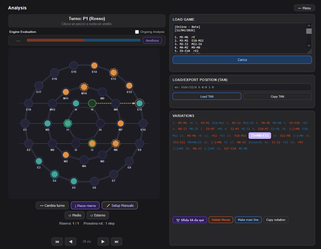 Tre Anelli (Three Rings) is a two-player abstract strategy game played on a circular board made of three concentric rings, Outer, Middle, and Inner.